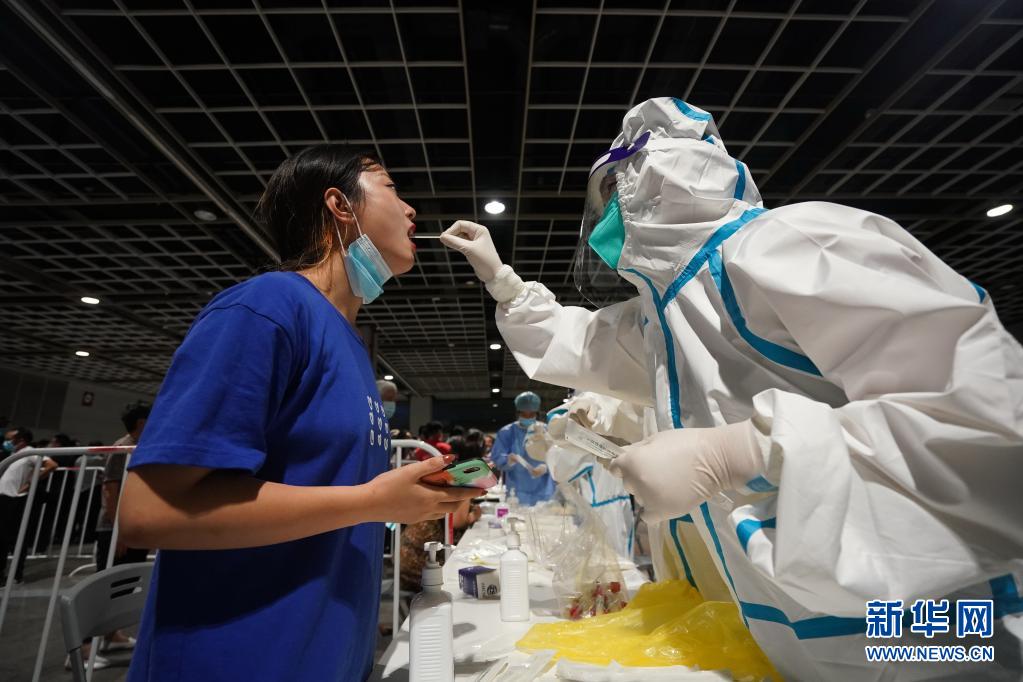 7月21日晚,在南京市玄武区一处检测点,医务人员在为市民进行核酸检测取样。新华社记者 季春鹏 摄
