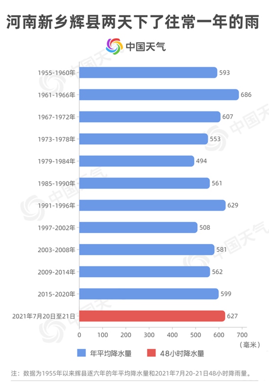 昨天08时至今天06时,河南强降雨仍在持续,主要集中在中北部,出现暴雨或大暴雨,安阳、鹤壁、新乡等地共7个国家级气象观测站日雨量突破有气象记录以来历史极值。降雨究竟有多强?截至昨天,河南鹤壁市科创中心单站累计降雨量已超过1000毫米,其中昨天24小时降雨量为777.5毫米。而在新乡辉县,两天雨量可与一年降雨量相比,这里过去两天雨量达627毫米,而1955年至2020年,这里一年的平均降雨量才只有579毫米。