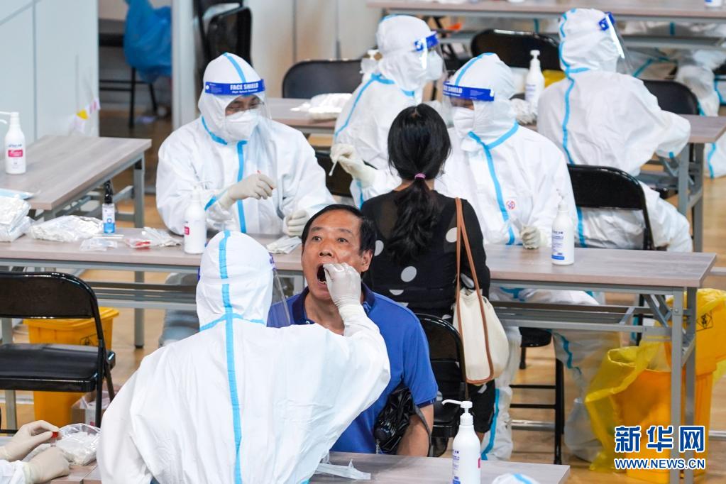 7月22日,市民在南京市鼓楼区五台山体育中心体育馆内进行核酸检测取样。新华社记者 李博 摄