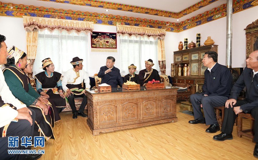 7月21日至23日,中共中央总书记、国家主席、中央军委主席习近平来到西藏,祝贺西藏和平解放70周年,看望慰问西藏各族干部群众。这是21日下午,习近平在林芝市巴宜区林芝镇嘎拉村,同村民达瓦坚参一家人围坐在客厅里聊家常。 新华社记者 李学仁 摄