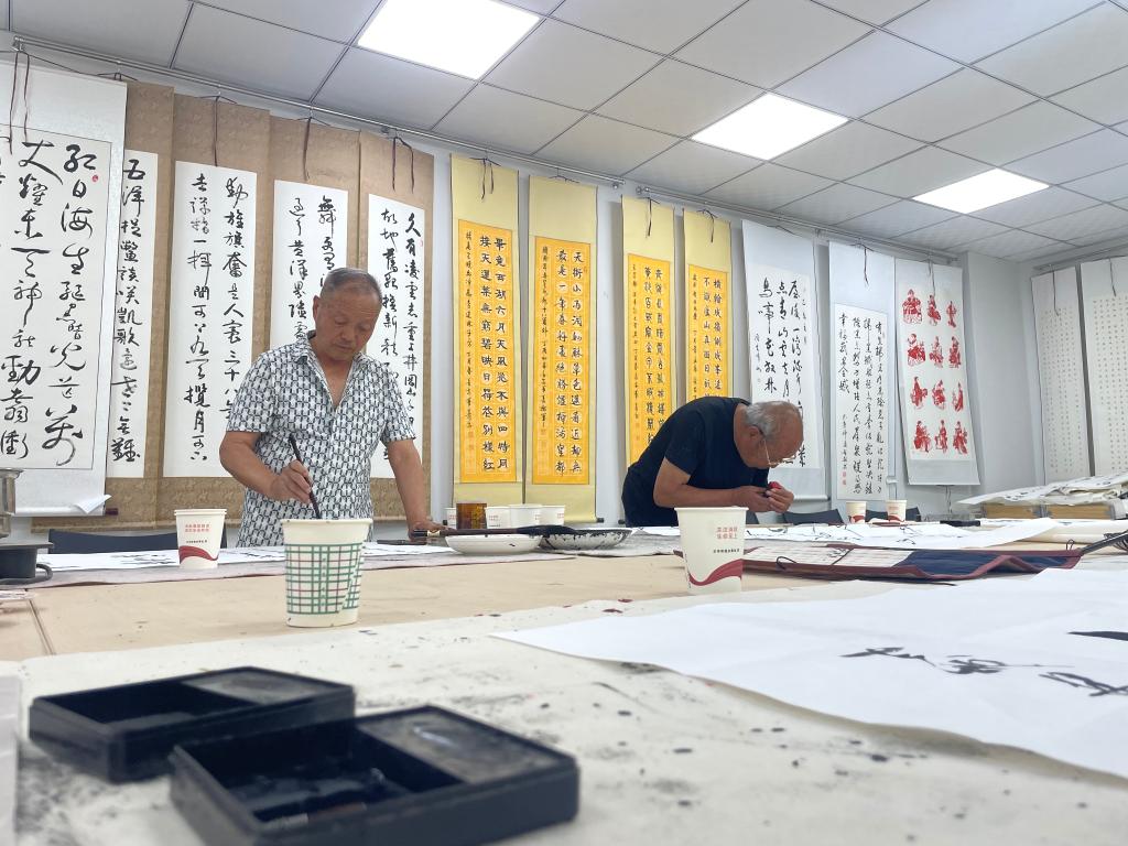 提笔轻盈、落笔有力,一幅临摹的书法作品在宣纸上渐渐浮现。58岁的张占永从“零基础”起步,3年来书法水平已有很大提高。书画室的墙面上,挂满了社区居民的作品。步入其中,墨香四溢。