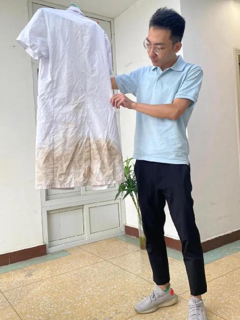 于逸飞向记者展示当时穿的白大褂。记者任卓如摄