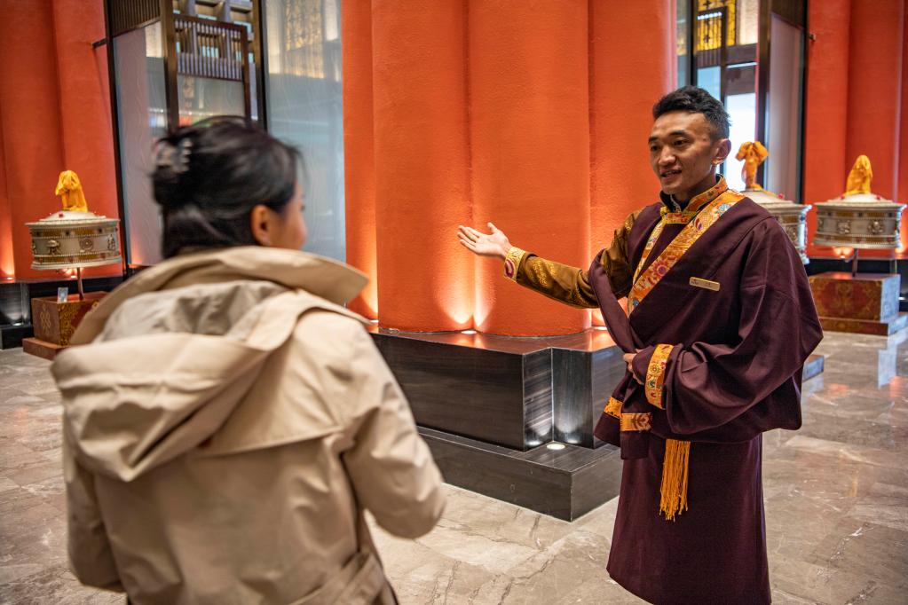 在鲁朗恒大酒店,旦增正在引导客人(4月2日摄)。新华社记者 孙非 摄