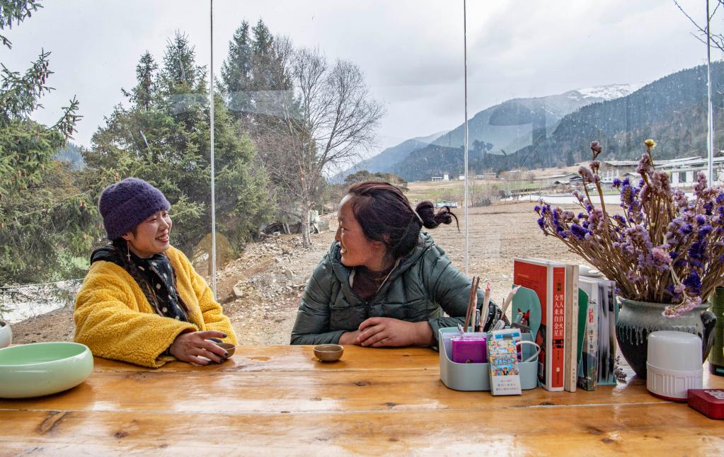 在牛棚改造成的民宿里,唐海玉和央金大姐在聊天(4月2日摄)。新华社记者 孙非 摄