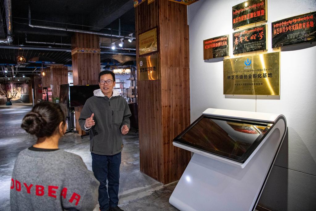 在林芝逐梦众创产业园,陆锦华正在向实习生介绍情况(4月2日摄)。新华社记者 孙非 摄