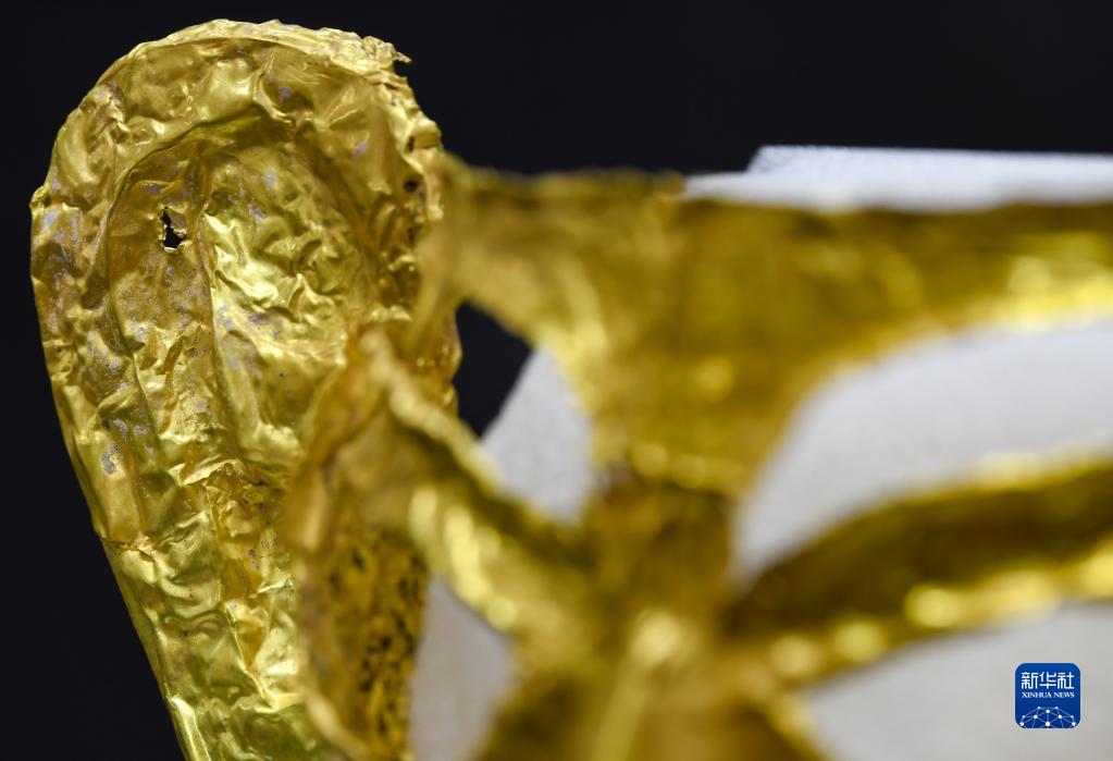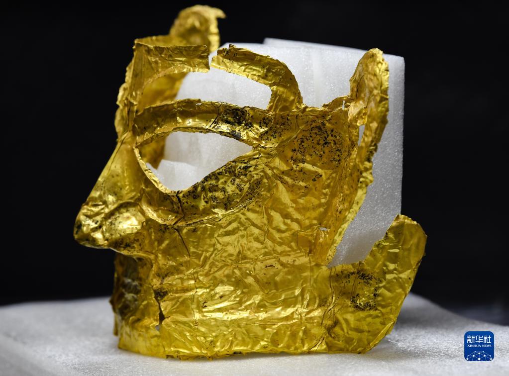 这是在四川省文物考古研究院三星堆考古研究所拍摄的三星堆遗址3号“祭祀坑”出土的金面具(9月2日摄)。新华社记者 王曦 摄