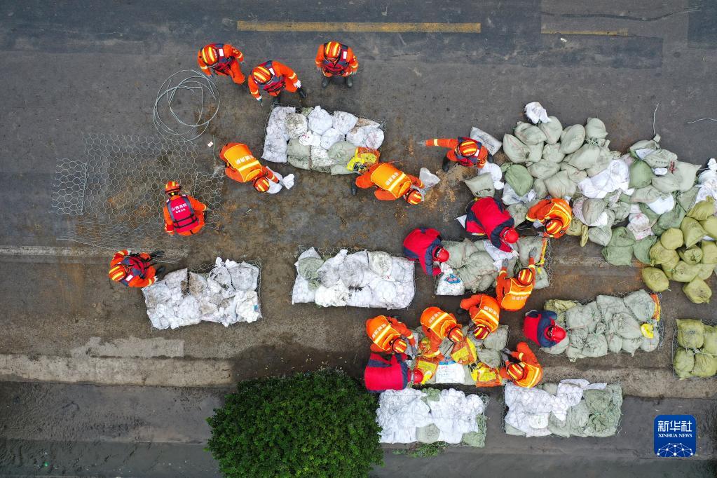 抢险人员在汾河下游稷山段下迪河坝段加固堤坝(无人机照片,10月11日摄)。新华社记者 詹彦 摄