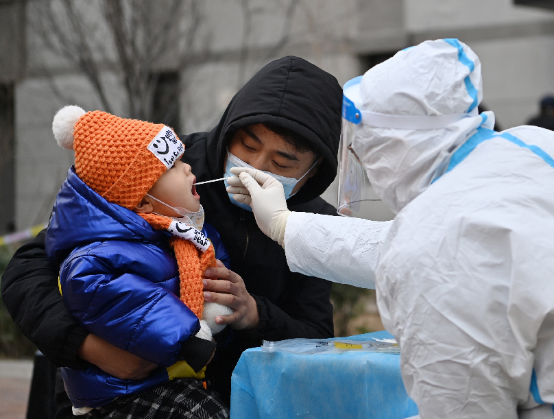 1月9日,在天津市西青区中北镇锦曦花苑社区一核酸检测点,家长抱着孩子进行核酸检测。