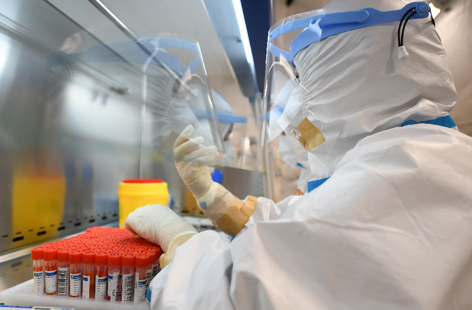 1月13日,在天津市北辰区某高校,气膜实验室工作人员在样本处理区作业。