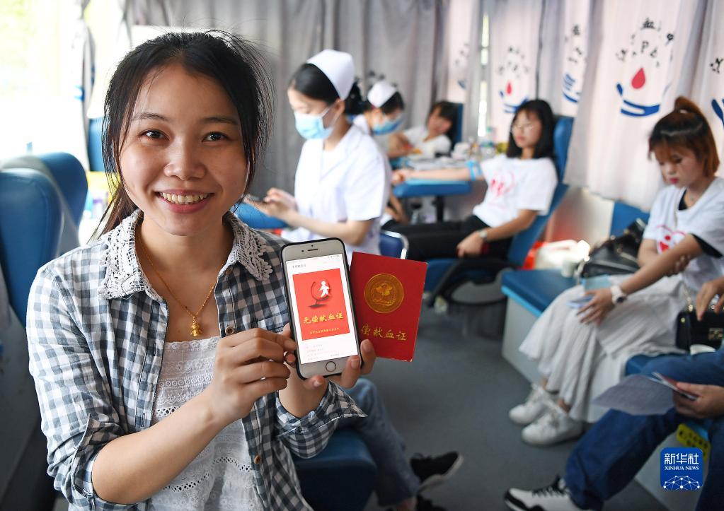 在南昌市的一处献血点,首名领取电子献血证的市民邓小姐展示手机“赣服通”里的电子献血证(2019年6月14日摄)新华社记者 万象 摄