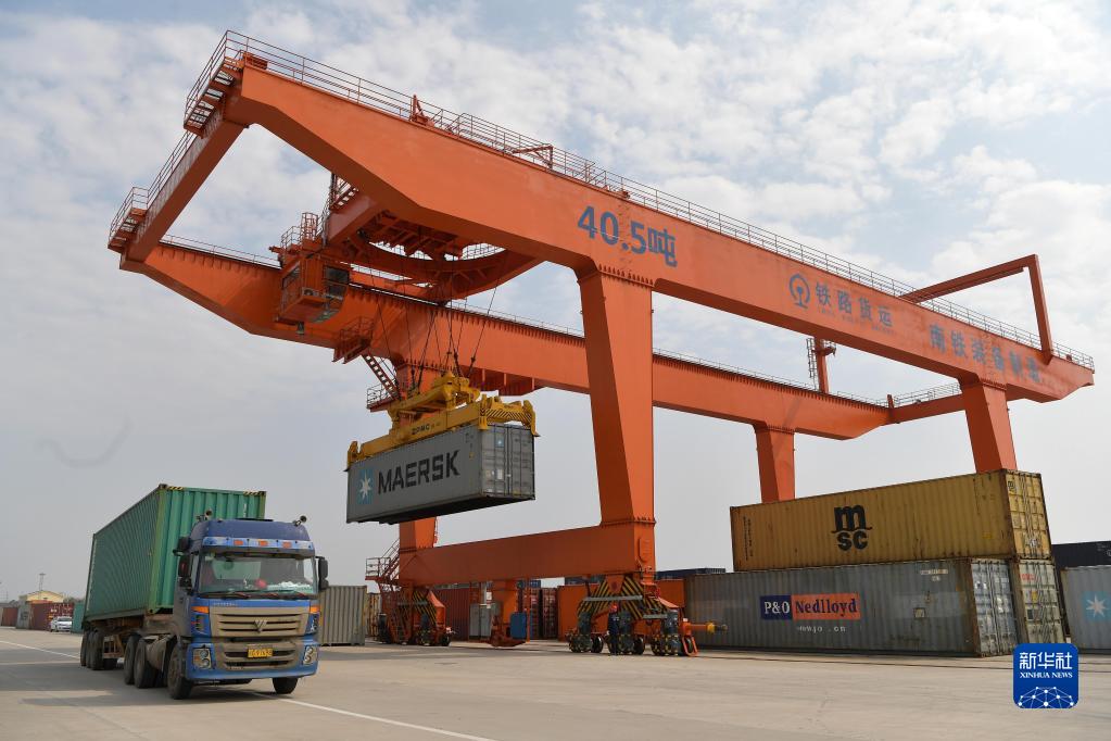 在江西省南昌县向塘铁路口岸,一辆货车进入口岸准备卸载集装箱(2020年4月6日摄)。新华社记者 彭昭之 摄