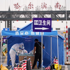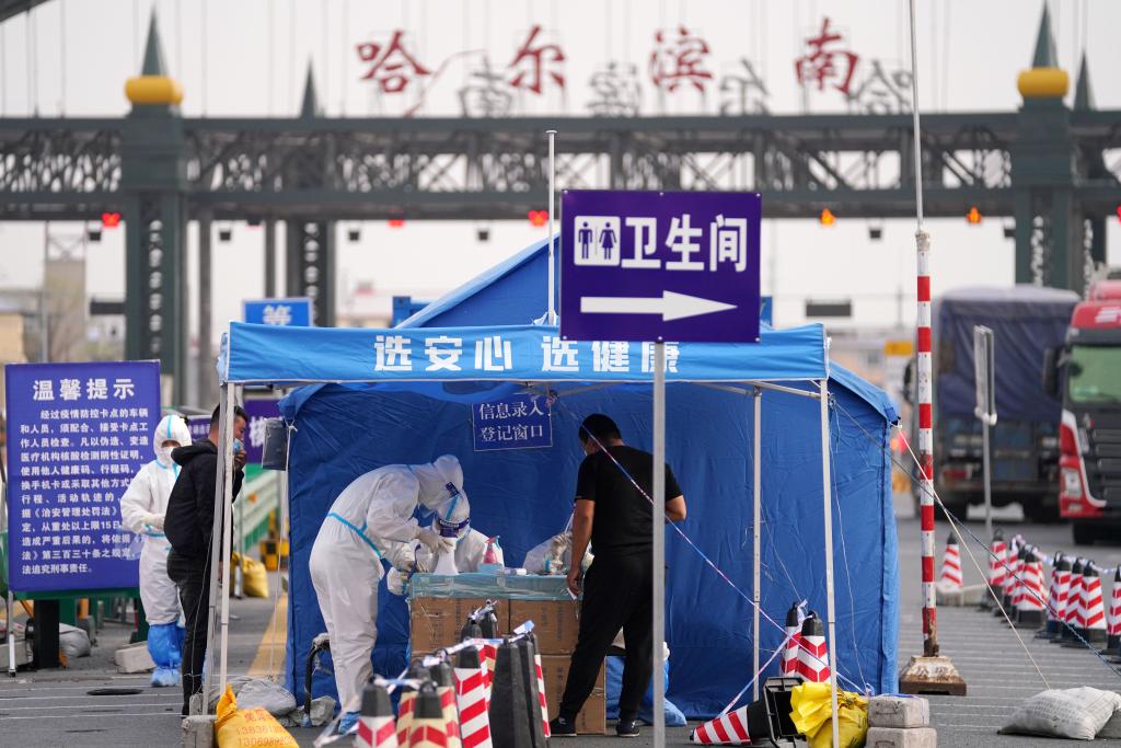 4月20日,在哈尔滨南收费站卡点,工作人员在对进城人员进行信息登记。新华社记者王建威 摄