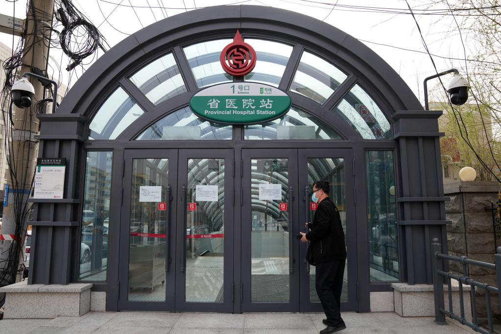 4月20日,在哈尔滨地铁2号线省医院站1号口,一位市民在观看地铁暂停运营的通知。新华社记者王建威 摄