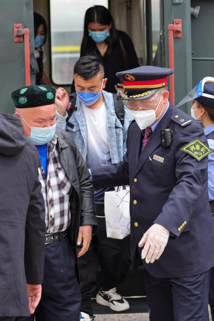 “和田玉龙号”列车长坡拉提汗搀扶行动不便的乘客下车(4月27日摄)。新华社记者丁磊 摄