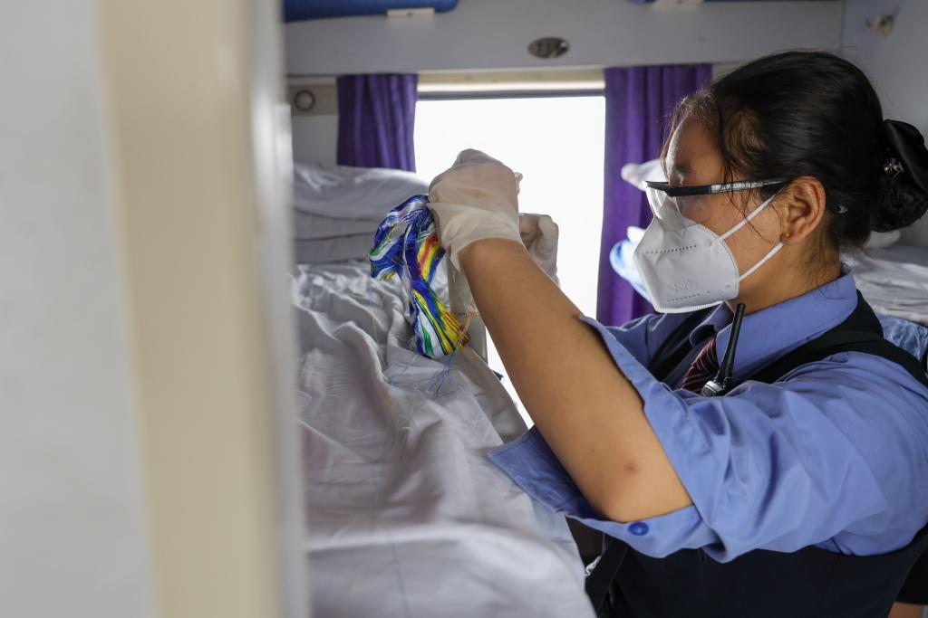 列车员在每一位重点旅客座位上系上艾德莱丝绸,根据其需求提供差异化服务(4月27日摄)。新华社记者丁磊 摄