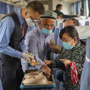 坡拉提汗负责这列“小慢车”的乘务工作已有9年,他精通汉语、维吾尔语和哈萨克语,热情周到的他和沿线群众早已打成一片,每周他有一半时间“住”在“和田玉龙号”上。
