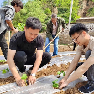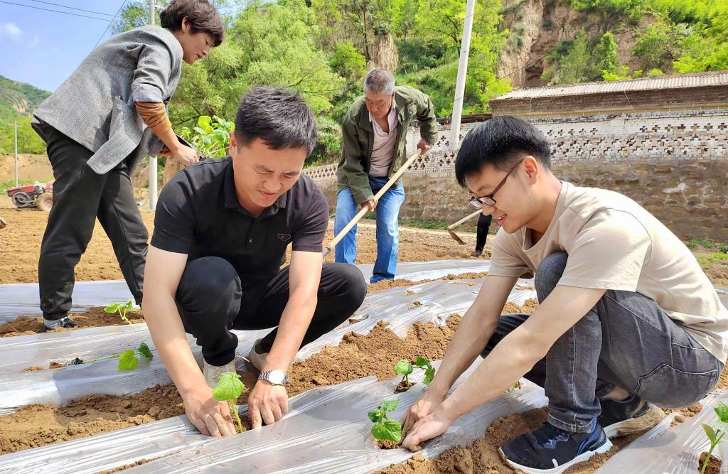 阮国兵(右一)正在河庄坪镇万庄村进行移苗工作。(受访者供图)