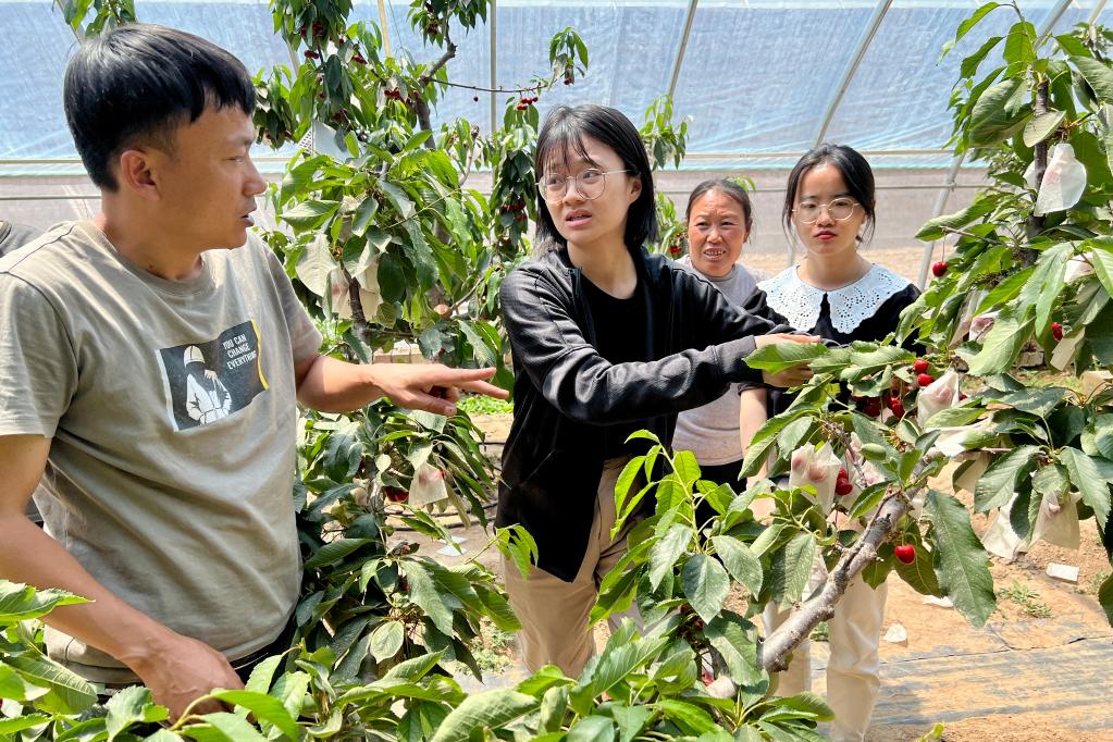 乡村振兴专项研究生潘滢(右三)和王芳(右一)正同村民在大棚内交流樱桃长势。(受访者供图)
