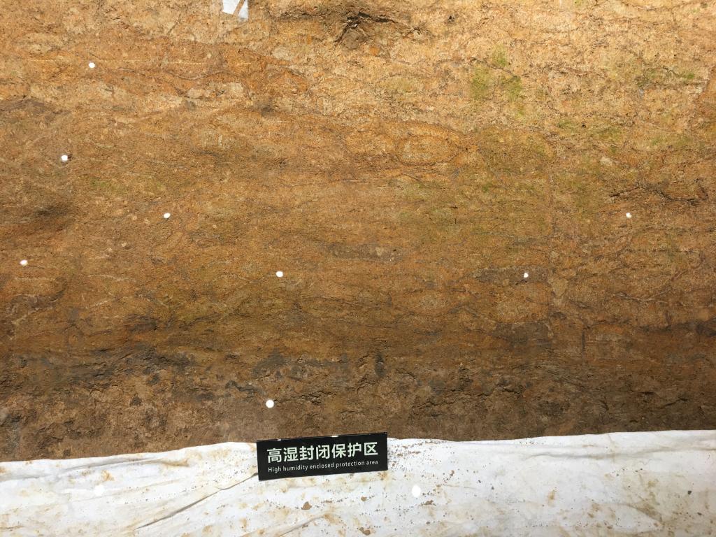 在棚内,一座大型保护罩将水坝北侧的一处剖面严密地防护起来。它采用加热玻璃材料,可以有效控制内部湿度。同时,外棚顶部铺设有防渗膜,底部辟有排水沟,坝体原始表面则种有既能缓解雨水冲刷,又能标识遗址本体的浅根系草皮。这一系列措施旨在有效预防渗水、干裂、表面粉化脱落、失色、微生物等病害。