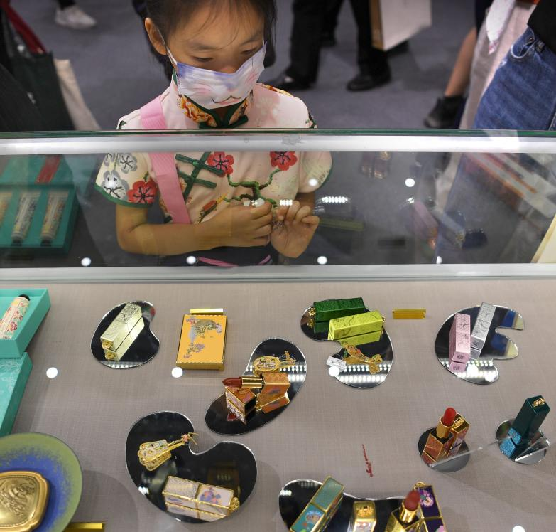 9月1日,小朋友在“博博会”故宫博物院展区观看文创产品。(新华社记者 李安 摄)