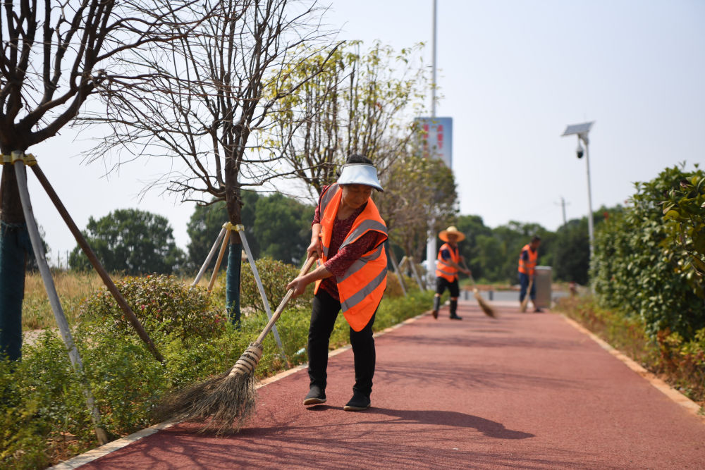 ↑ 2022年9月27日,湖南省沅江市莲花岛村的退捕渔民在打扫人行道。
