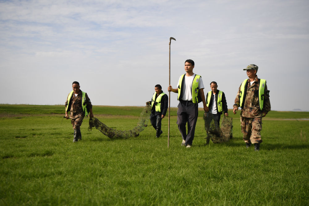 ↑ 11月11日,何东顺(中)、何大明(右一)和渔民环保志愿者一起在湖南省岳阳市东洞庭湖湿地巡护。