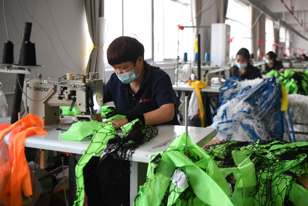 ↑ 2022年9月27日,工人在湖南省沅江市湖南星海运动用品有限公司加工运动用网。近年来,这家传统渔网生产企业转型生产运动休闲用网。