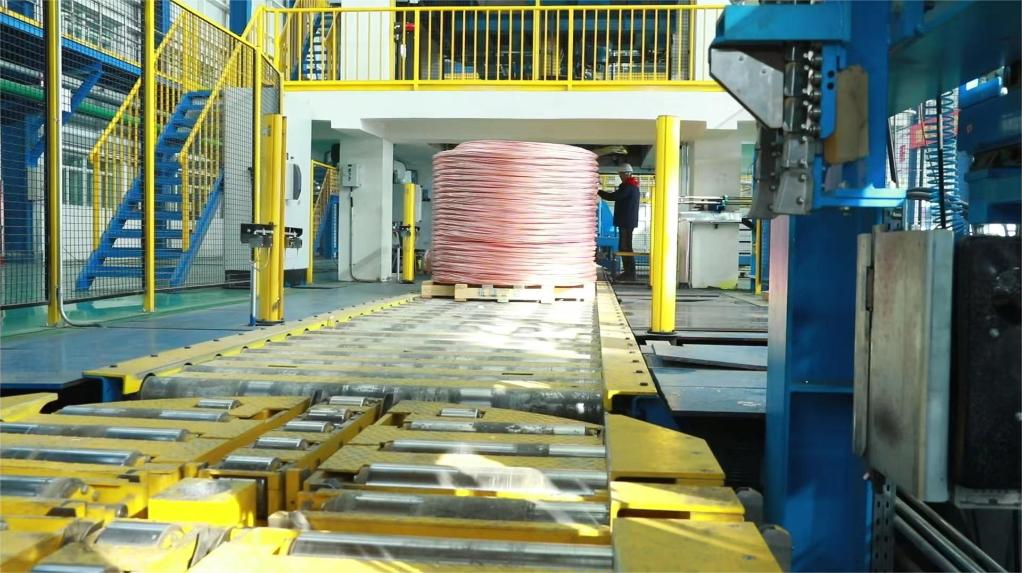 2月16日,正威国际集团新疆新材料产业园生产车间,被包装好的铜杆卷即将下线。(新华社记者潘莹 摄)