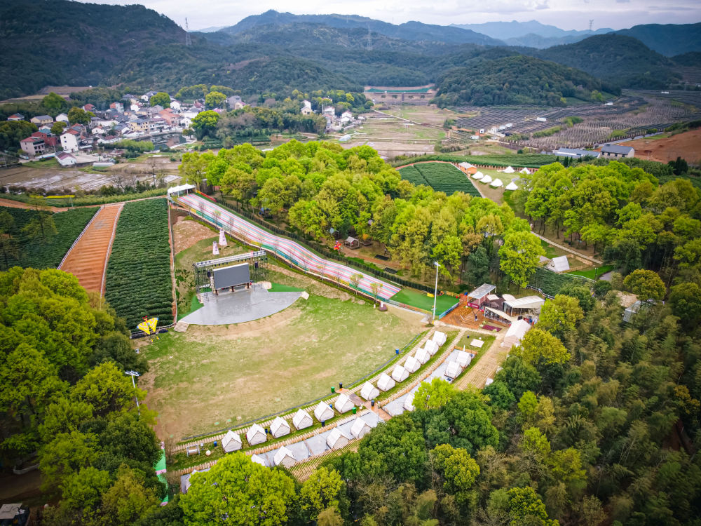这是2023年3月29日拍摄的诸暨市枫桥镇阳春村阳春山月游乐度假村(无人机照片)。当地通过闲置荒山土地流转发展乡村旅游,帮助当地村民和村集体增收。新华社记者 江汉 摄