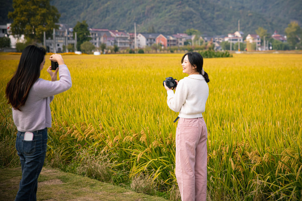 2022年10月25日,游客在浙江省桐庐县桐君街道梅蓉村的稻田内观光。新华社记者 江汉 摄