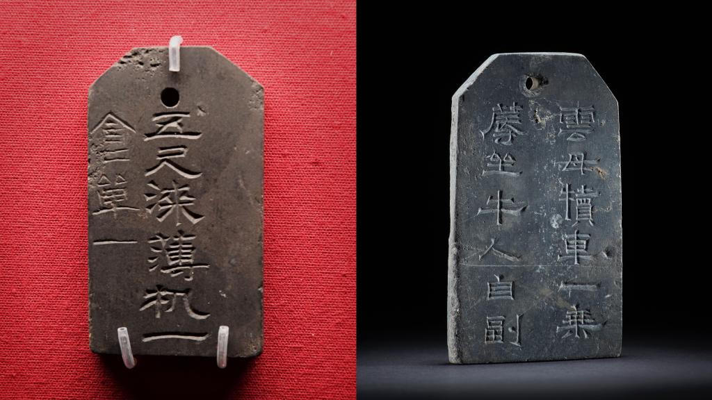 右:洛阳西朱村曹魏大墓出土的刻铭石牌。(洛阳市文物考古研究院供图)