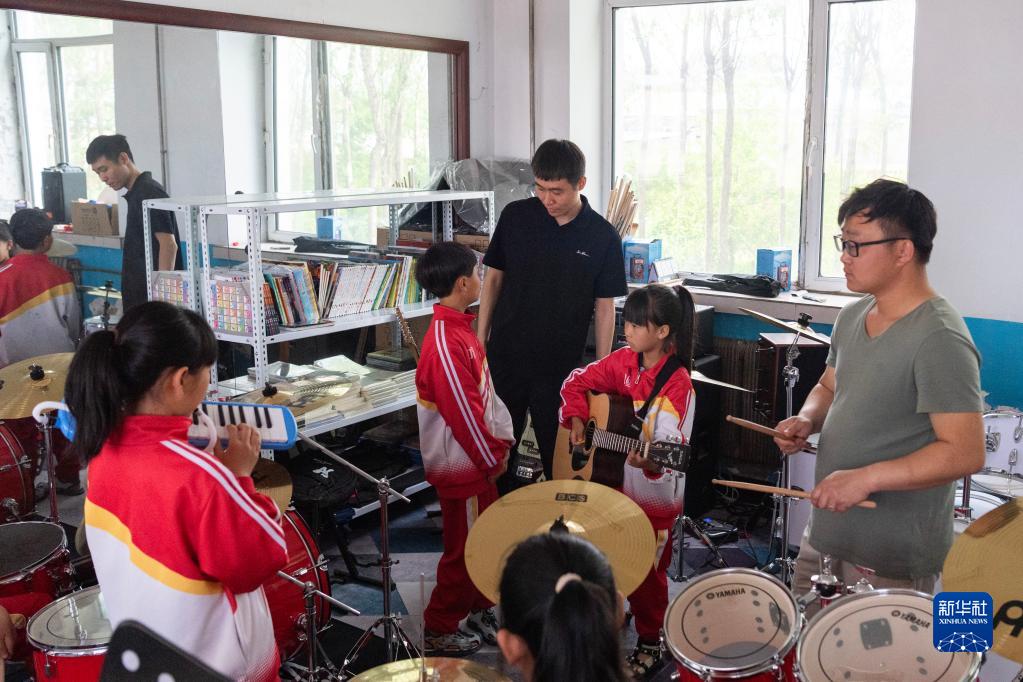 5月29日,在黑龙江省安达市任民镇中心小学,音乐老师指导音乐班的孩子进行乐队排练。新华社记者 谢剑飞 摄