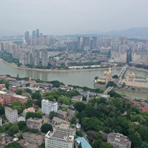 6月13日,福州烟台山、爱情岛、中洲岛及闽江北岸的青年广场等组成的闽江之心。新华社记者林善传 摄
