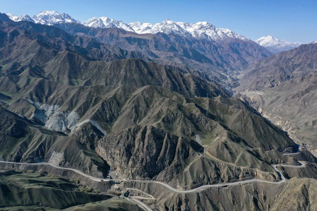 5月11日拍摄的新疆独库公路。海拔较低的山体积雪已消融,远山更高海拔处依旧白雪皑皑(无人机照片)。新华社记者胡虎虎 摄