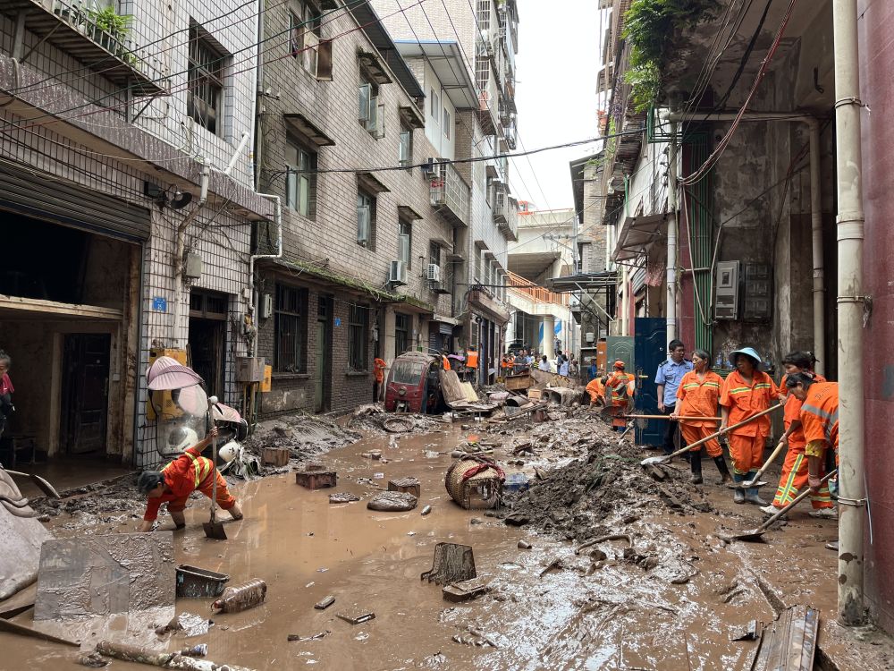 7月5日,武警官兵在万州区五桥街道受灾地区的街巷中进行清理作业。新华社发(冉孟军 摄)