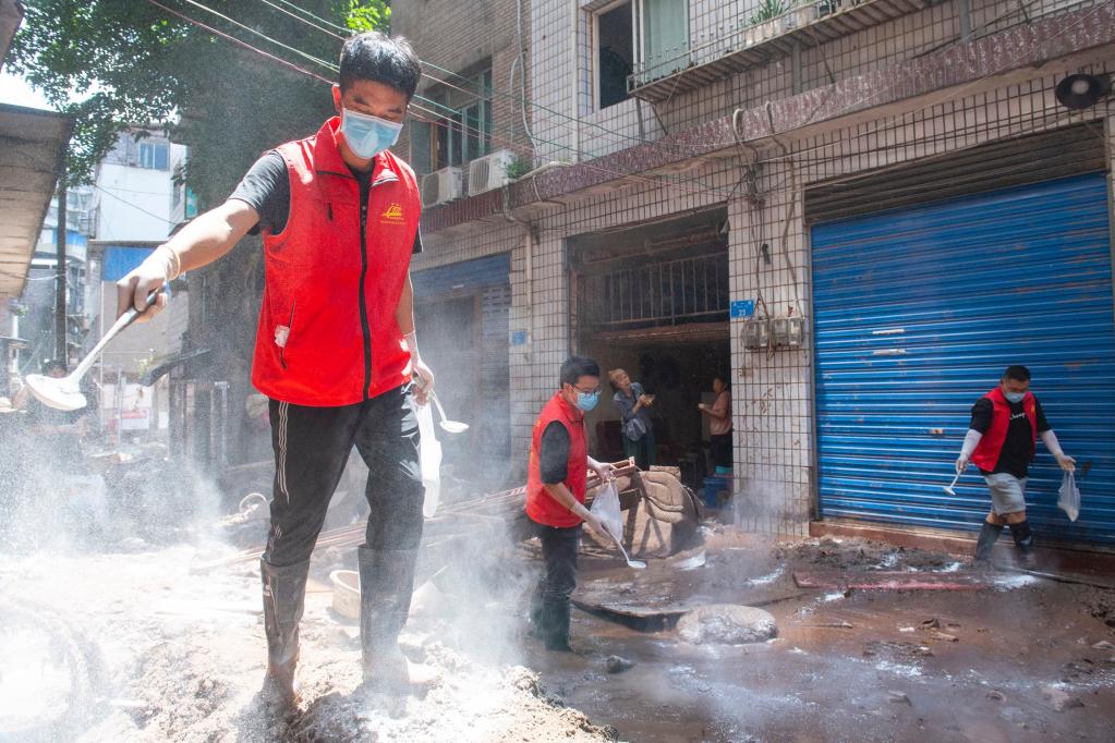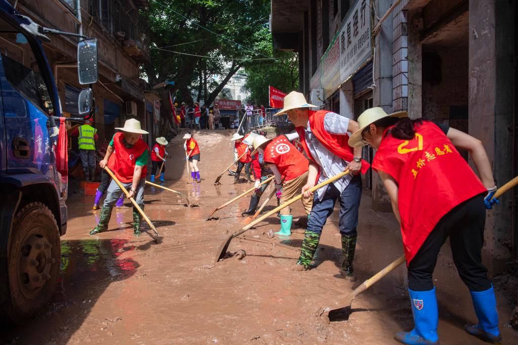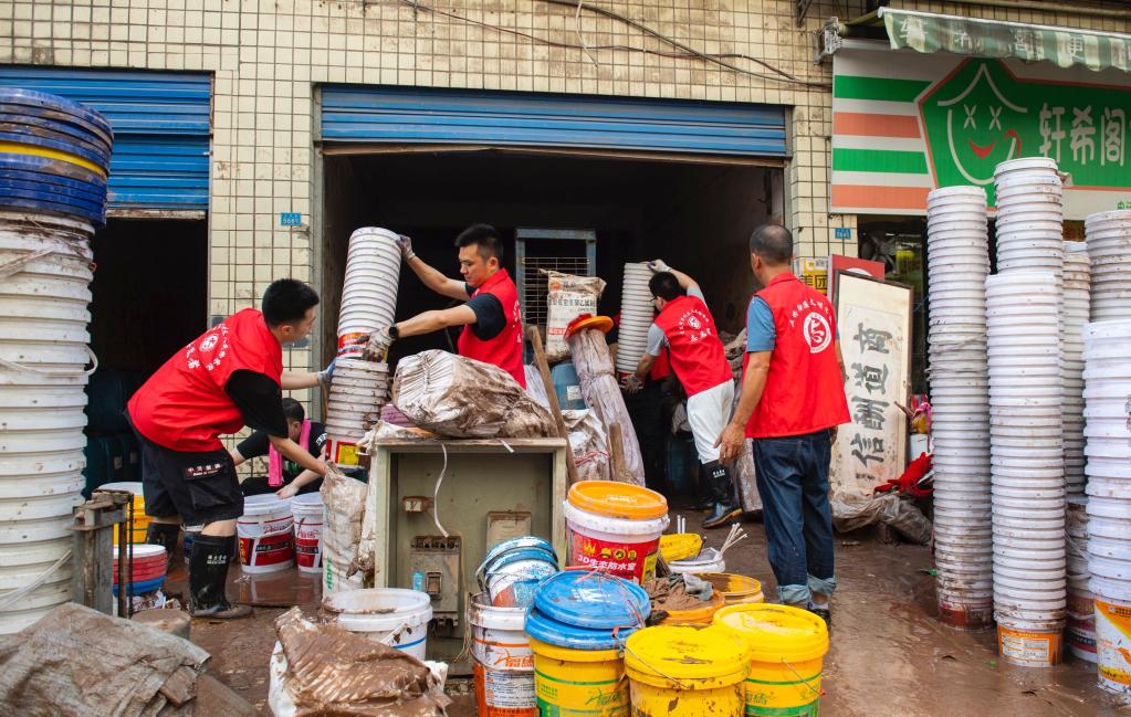 7月5日,来自万州区的志愿者在五桥街道受灾地区协助当地群众展开生活、生产恢复工作。新华社发(冉孟军 摄)