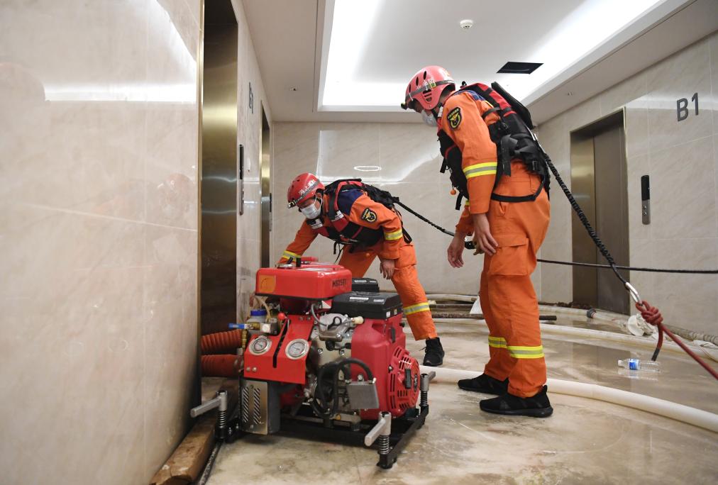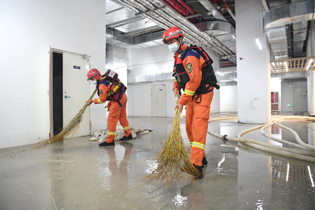 8月7日,邢台市消防救援支队队员在河北省涿州市万科城际之光写字楼B1地库清扫积水。
