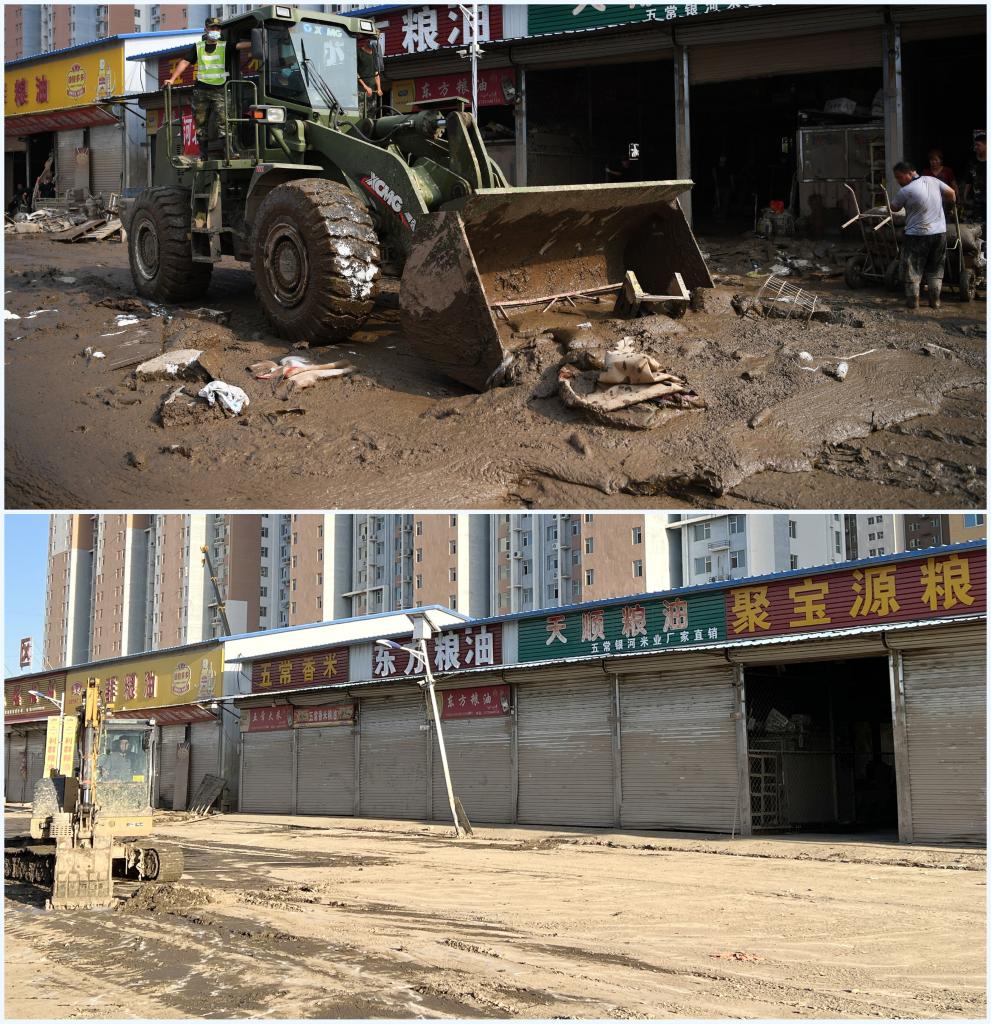 拼版照片:上图为8月9日武警战士驾驶铲车在大石桥市场清淤(新华社记者朱旭东摄);下图为8月22日拍摄的大石桥市场(孙岩涛摄)。