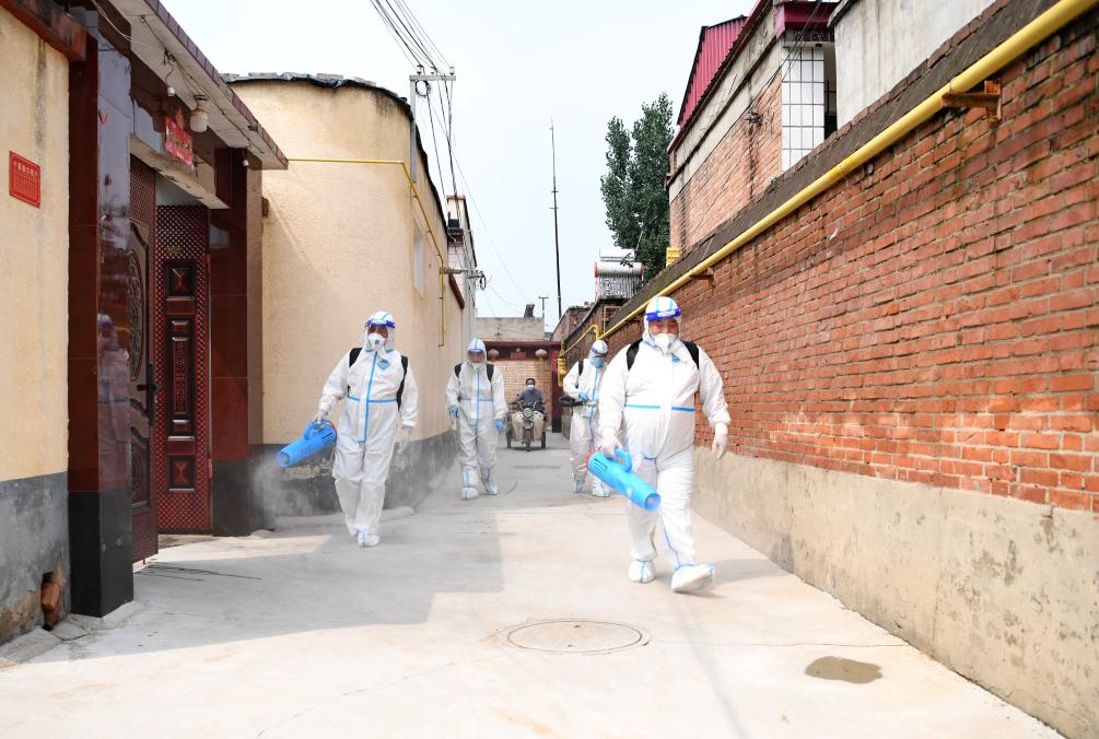 8月8日,来自山西的退役军人志愿者在涿州市桃园街道忠义店村开展消杀作业。