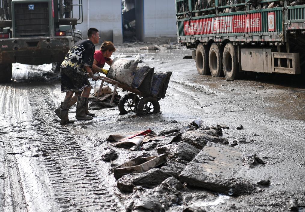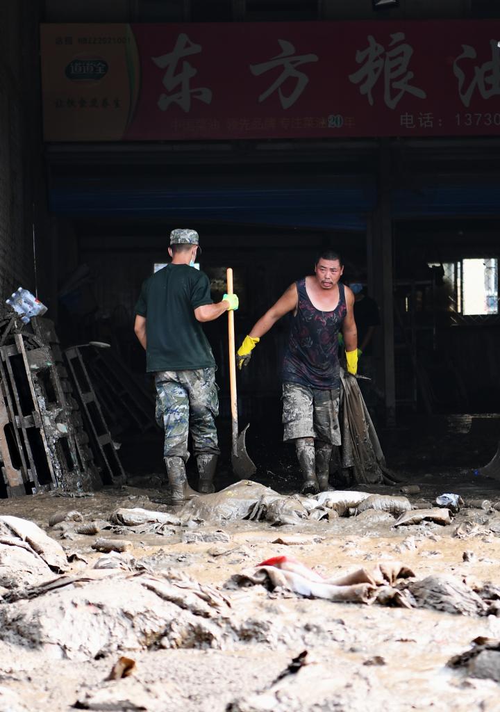 8月10日,在大石桥农副产品批发市场,武警战士和商户在清理垃圾和淤泥。