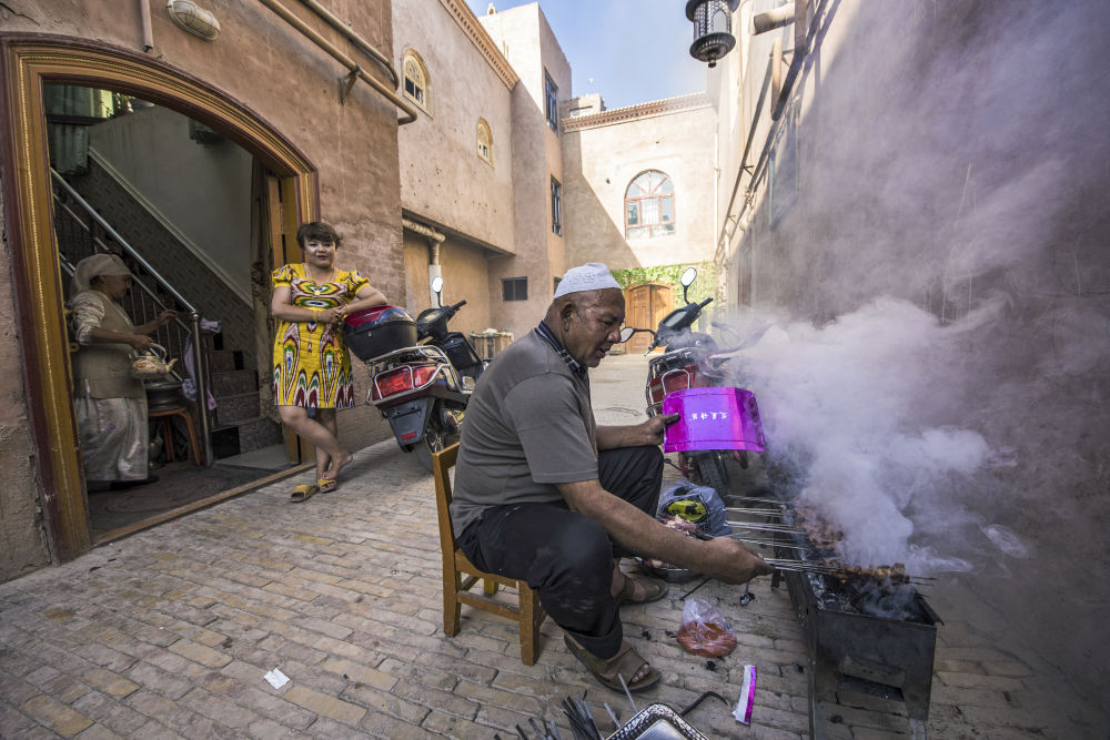 喀什古城居民在家前烤肉。新华社记者 沈桥 摄