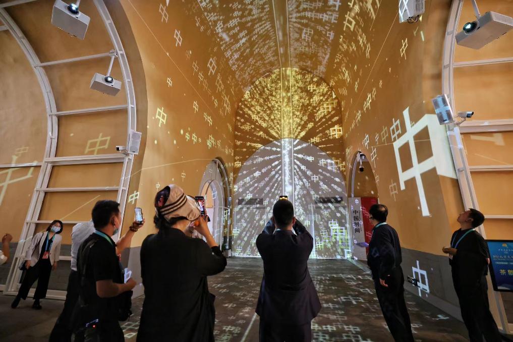 图为2023北京文化论坛嘉宾参观北京鼓楼展出的数字互动体验展。(北京市东城区委宣传部供图)