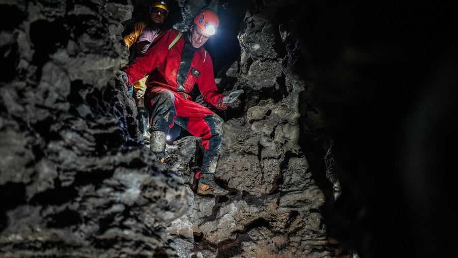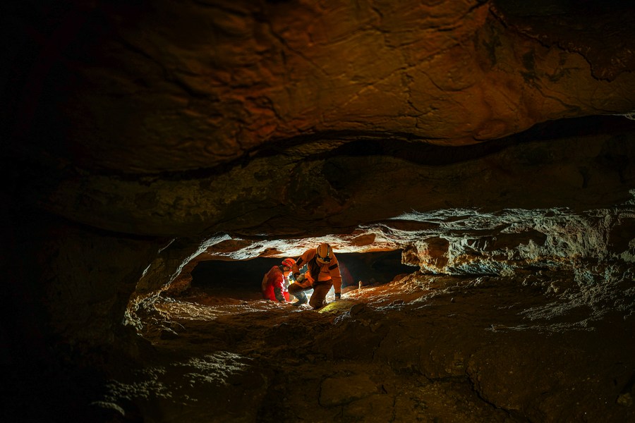 9月22日,意大利专家和贵州省山地资源研究所科考队员在双河洞一处支洞中进行科考。新华社发(赵飞 摄)