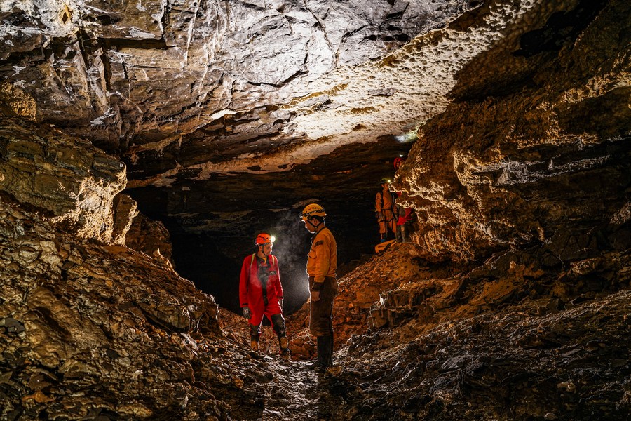 9月24日,中外科考人员在贵州省双河洞内开展科考。新华社记者 骆飞 摄