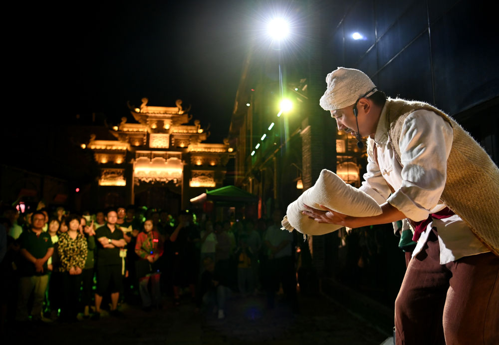 游客在长安十二时辰主题街区观看唐风演艺《将进酒》(2023年8月2日摄)。新华社记者 邹竞一 摄