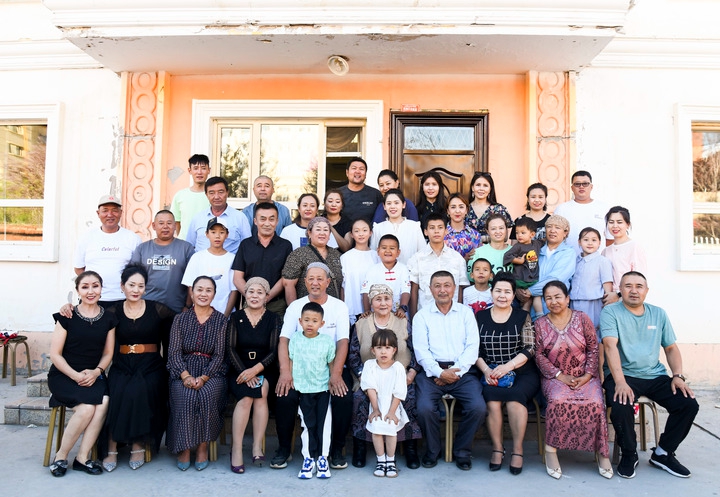 在位于新疆青河县的家中,阿尼帕(前排右五)和家人一起拍摄全家福(2022年7月10日摄)。组图均由新华每日电讯记者 王菲 摄
