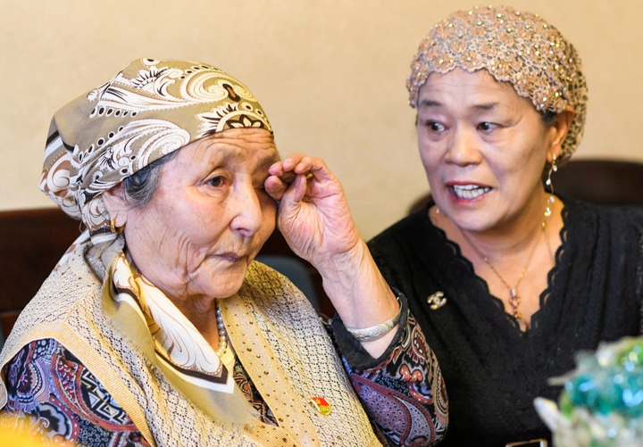 在位于新疆青河县的家中,阿尼帕(左)和养女王淑珍一起回忆往事时留下眼泪(2022年7月10日摄)。