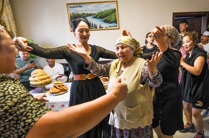 在位于新疆青河县的家中,阿尼帕(中)和家人在欢度古尔邦节时跳舞(2022年7月10日摄)。