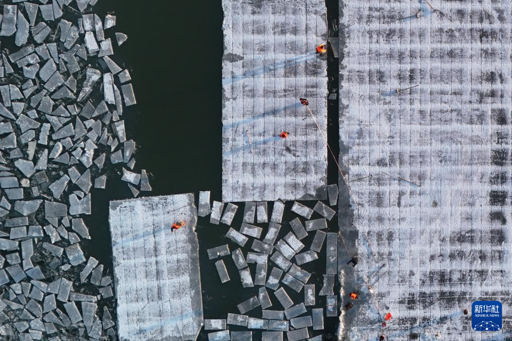 工人在松花江上的采冰现场进行采冰作业(无人机照片,2023年12月4日摄)。新华社记者 张涛 摄