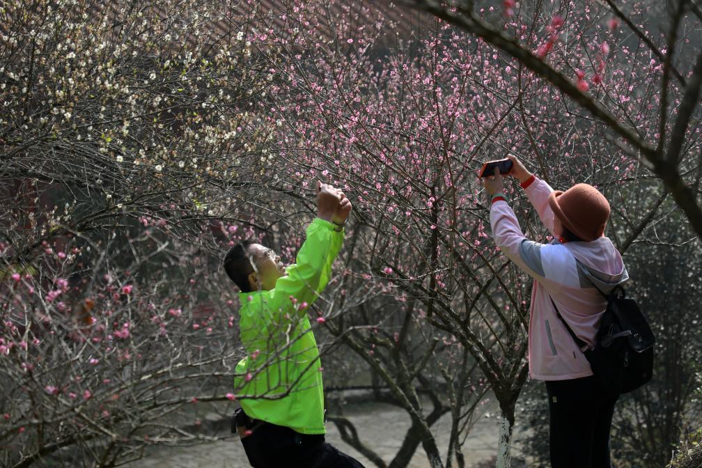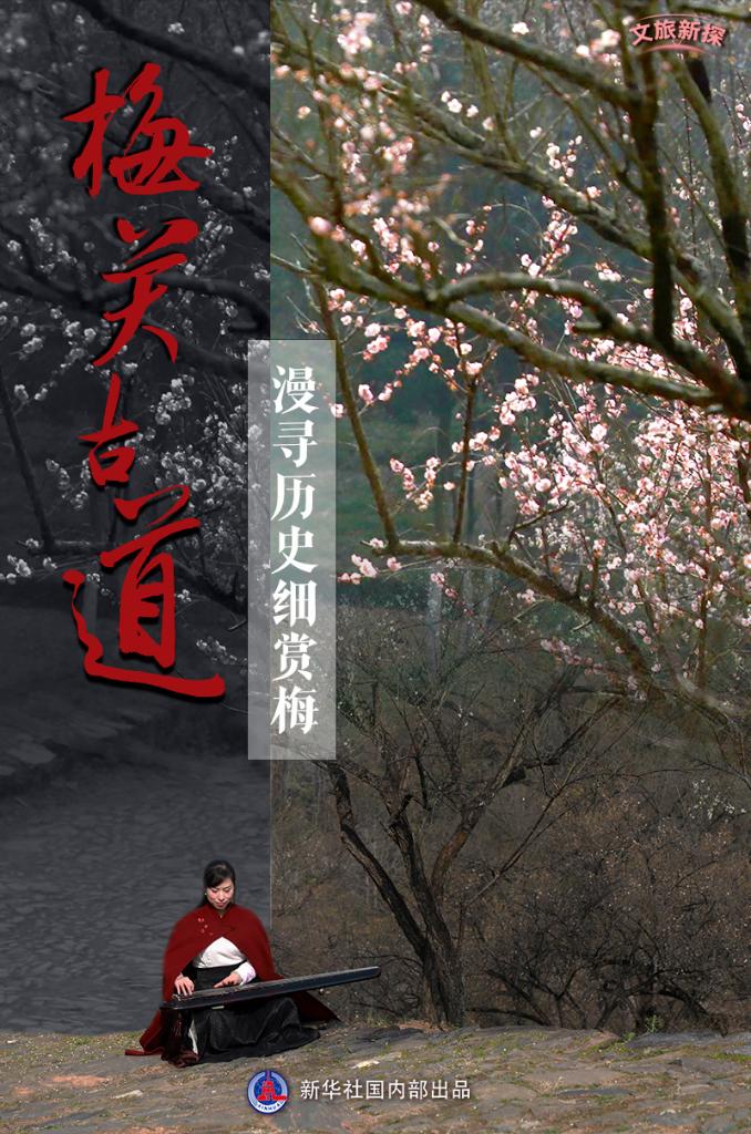 记者看到,飘落的梅瓣下,三两游客身着传统服饰,或撑伞而立,或席地抚琴,美不胜收。从广州自驾而来的吴女士在一片红梅前流连忘返,“早就盼着来赏梅花!踏上古道,除了赏景,还可沉浸在千百年来的历史风韵中,仿佛在跟古人对话。”